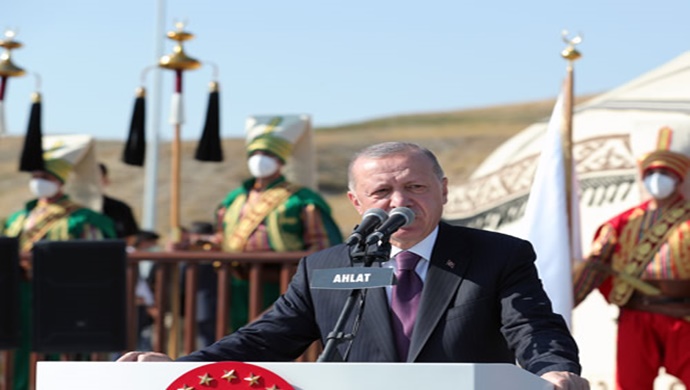 Malazgirt Zaferi’nin 950. yılının hayırlara vesile olmasını dileyen Cumhurbaşkanı Erdoğan, “Demiri demirle dövenlerin Anadolu’yu aşkla yoğuranların destanına şehadet etmek üzere bir kez daha Ahlat’tayız” ifadesini kullandı.