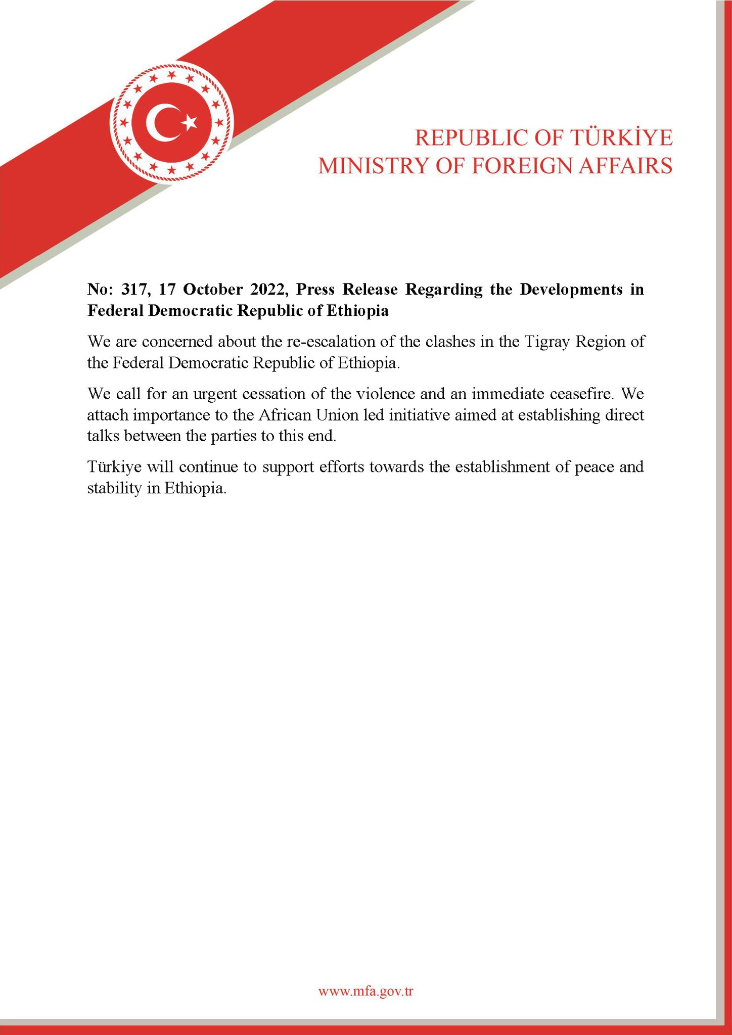 No: 317, 17 October 2022, Press Release Regarding the Developments in Federal Democratic Republic of Ethiopia